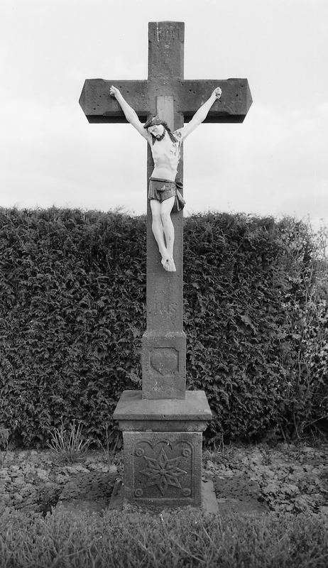 Am südlichen Ortsausgang plaziertes sandsteinernes Kruzifix mit zur Restaurierung abgenommenem Korpus. Im Postament sind drei Seiten mit Inschriftenfeldern angelegt: auf der Vorderseite ein achtstrahliger Stern, rechts drei Deutschordenskreuze, die Buchstaben A und B sowie das Datum 1872, links die Jahreszahl 1930. Im Sockel des Kreuzstammes ist ein herzförmiges Relief eingelassen. Ortsgeschichtliche Bedeutung als Zeugnis der Frömmigkeit auf dem Lande.