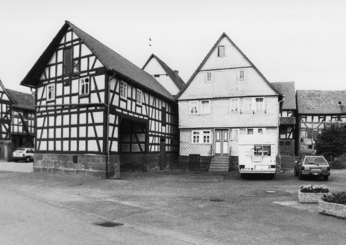 Mehrteilige Hofanlage auf einem schmalem Grundstück an einer Straßenaufweitung des Brunnenweges. Ungewöhnlich das giebelseitig aufgeschlossene Wohnhaus und der ebenfalls giebelständige Torbau. Das Wohnhaus aus dem frühen 18. Jh. ist ein großenteils plattenverkleideter Rähmbau mit zur Straßenseite ausgeprägtem Geschoßversatz, Schwellriegeln auf dem Hausteinsockel und einfachem Dreiviertelstreben-Gefüge sowie von außen zugänglichem Keller. Als hinterer Hofabschluß die querstehende Scheune in lebhaftem Gefüge des 18. Jhs. mit Kratzputzgefachen, ebenfalls in weitgehend ursprünglichem Zustand der Stall, das Bäuchen, der gußeiserne Pumpenbrunnen sowie die in das Sandsteinpflaster eingelassene, basaltgefaßte Miste. Der Torbau als jüngster Teil stammt aus dem 19. Jh.