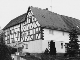 Dreiseitige, am ansteigenden Gelände gelegene Hofanlage, mit Haus Nr. 11 zu einem U-förmigen Konglomerat zusammengewachsen. Der Wohnteil traufseitig auf hohem Sockel, das Erdgeschoß inzwischen massiv erneuert, am Obergeschoßgiebel dekoratives Fachwerk sichtbar, das sich wohl auch unter der Plattenverkleidung verbirgt. Während der Wohnteil in die zweiten Hälfte des 18. Jhs. zu datieren ist, stammen die Wirtschaftsbauten aus dem 19. Jh.