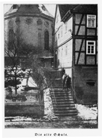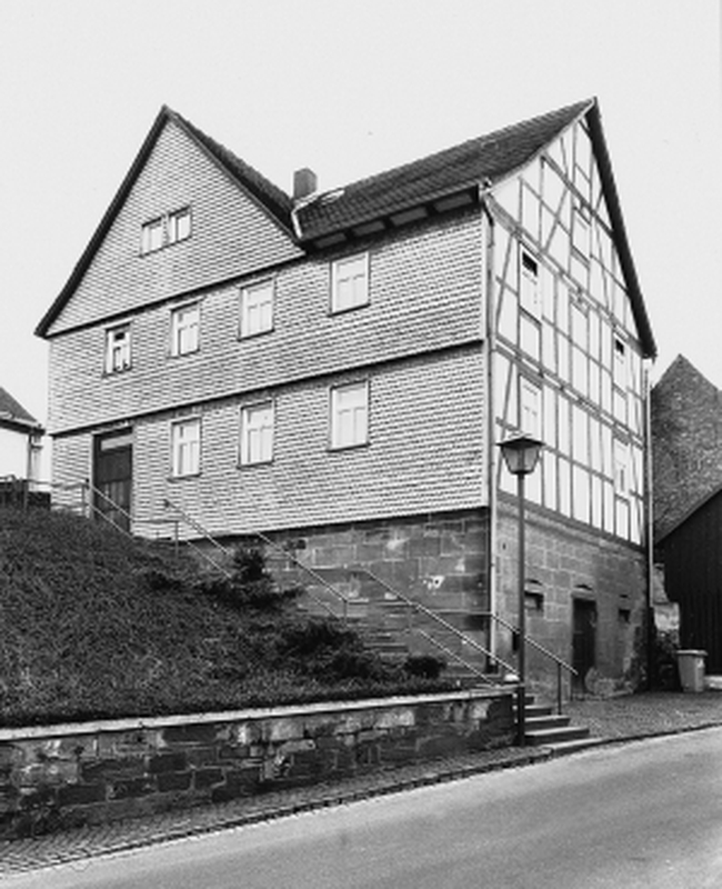 Ehemaliges Schulgebäude von Allendorf als wichtiger Bestandteil der den Kirchhof umgebenden Bebauung; zur Wehrmauer traufständig angeordneter Rähmbau, nach der Überlieferung 1704 erbaut, das Fachwerk mit profiliertem Geschoßversprung heute teilweise mit Holzschindeln behangen, der rechtwinklige Anbau stammt aus dem späten 19. Jh. Vor dem von der Hofstraße aus hochaufragenden Bau läuft eine lange Treppe vorbei, die als östlicher Zugang zum Kirchhügel durch ein Tor der Kirchhofmauer führt.