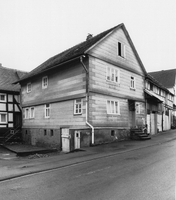 Giebelständiges, über einige Stufen an der Schmalseite erschlossenes Wohnhaus. Die zugehörige Hoffläche tieferliegend, um den im hohen Sockel untergebrachten Stall anzubinden. Fassade vollflächig mit Platten verkleidet, darunter Fachwerk mit umlaufendem Geschoßversprung möglicherweise noch aus dem 18. Jh. zu erwarten.
