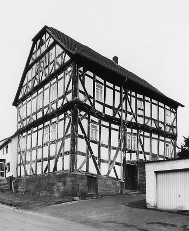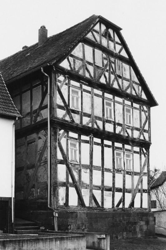 Als ehemalige Mainzer Kellerei bekanntes, für das Ortsbild bedeutendes Gebäude von imposanter Größe, das als Amtshaus und später als Försterei fungierte. Giebelständiger Rähmbau auf einem dem Hang angepasstem Quadersockel mit seitlichem, eingetieftem Eingang, das Fachwerk reicht mit seinen langen Streben weit in den Keller, die profilierten Eckstiele stehen direkt auf dem Sockel; das Obergeschoß mit umlaufender, schnitzverzierter Auskragung und das Giebeldreieck sind reich gestaltet durch Mannfiguren, deren Sporne in die Folge der geschweiften Brüstungsstreben eingereiht sind. Der Bau, dessen Entstehung in die Mitte des 17. Jhs. zurüchgeht, ist im Dach durch Krüppelwalme abgeschlossen.