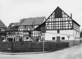 Zur Straße offener Dreiseithof mit traufständigem Wohnhaus, das den Hofraum nach hinten abschließt. Rähmbau mit inzwischen massiv erneuertem Erdgeschoß, das Fachwerk im Obergeschoß durch die auf dem Halsriegel versetzten Kopfbänder und die verzierten Eckstiele von Interesse. Entstehungszeit im frühen 19. Jh. Die Scheune laut Inschrift 1840 errichtet, das mit dekorativen Fachwerkformen gegliederte Stallgebäude stammt aus dem späten 19. Jh.