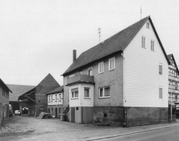 Weit in die Tiefe des schmalen Grundstücks reichende Hofanlage mit großvolumigem Wohnhaus, das als giebelständiger Fachwerkbau auf hohem Werksteinsockel wesentlicher Teil der dem gebogenen Straßenverlauf folgenden Bebauung ist. Traufseitig Holzschindelbehang, die Bauzeit 1840-1860. Im Anschluß kleines Stallgebäude mit massivem Untergeschoß und zu Wohnzwecken genutztem Obergeschoß.