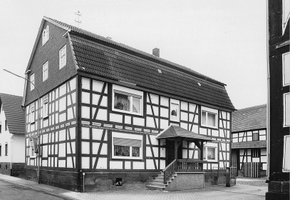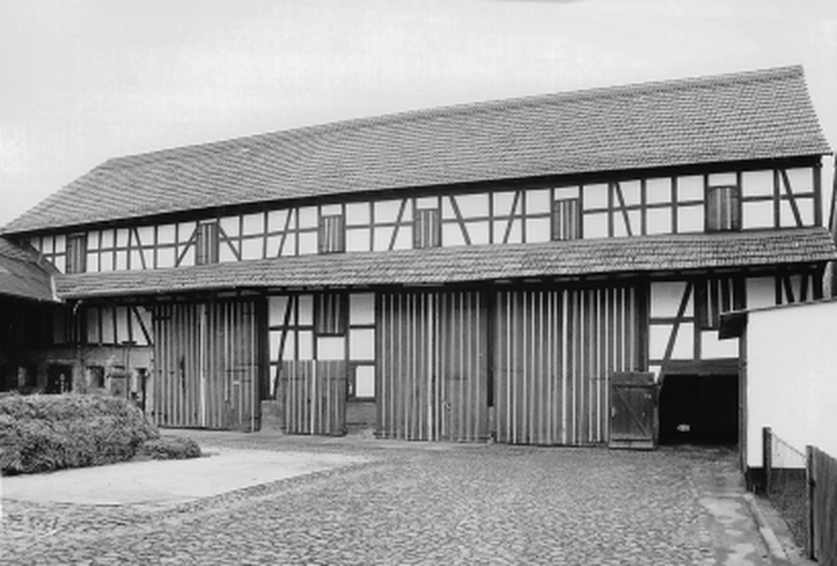 Dreiseithof mit giebelständigem Wohnhaus, das als Kopfbau der Hallegasse von Bedeutung für das Ortsbild ist. Das Wohnhaus ist ein repräsentativ wirkender Rähmbau mit Mansarddach, das Fachwerk mit konvergierenden Streben. Auf dem Rähm befindet sich eine längere Inschrift mit der Datierung 1882. Störung durch unproportionierte Fenstereinbauten. Im Giebeldreieck ein Zwillingsfenster mit spitzem Abschluß. Die Wirtschaftsgebäude sind etwa zeitgleich entstanden.