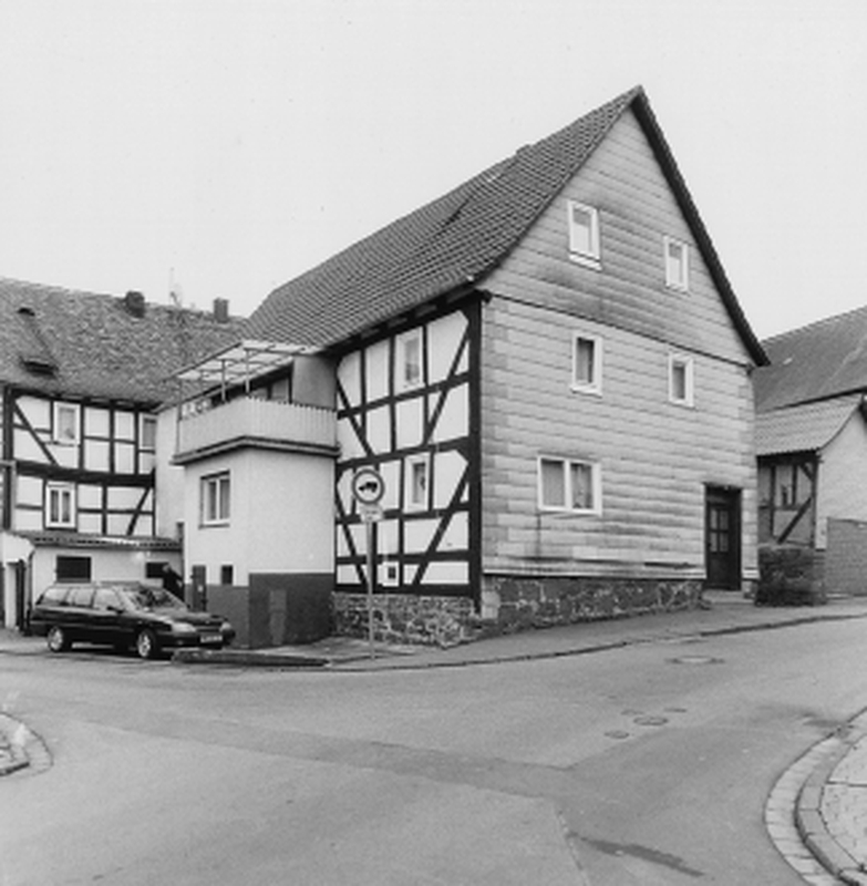 Durch die ansteigende Straße und die Ecklage zur Mittelgasse städtebaulich exponiertes Wohnhaus; Ständerbau auf Bruchsteinsockel. Bis in den Keller reichendes Fachwerk mit Schwellriegelverzimmerung, Aussteifung durch breitstehende Streben mit Kopfholz. Eingang ursprünglich giebelseitig, hier heute Plattenverkleidung. Hinten im Gebäude ist der Stall untergebracht. Die Bauzeit ist in der ersten Hälfte des 18. Jhs. anzusetzen. Störung durch traufseitigen Eingangsvorbau.