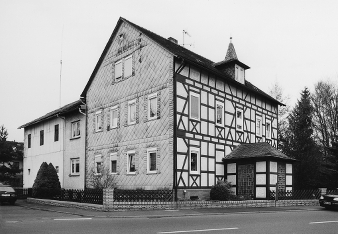 Schräg im Straßenraum angeordnetes traufständiges Wohnhaus mit Kniestock, zeittypisch gestaltetes Rähmfachwerk in mit Andreaskreuzen in den Brüstungsfeldern, die Gefache durch Kratzputz verziert, über dem Eingang spitzhelmbesetzte Gaube. Gut erhaltener Vertreter für die Weiterführung der Fachwerktradition im ausgehenden 19. Jh.
