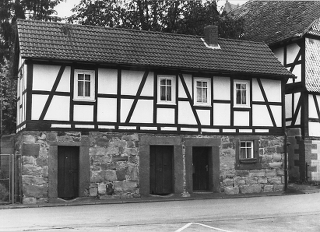 Schmaler, traufständiger Bau gegenüber einer Straßenaufweitung, vermutlich Wohnstatt eines Gemeindehirten o.ä., das Erdgeschoß massiv in Bruchstein mit Sandsteineinfassungen, über der mittleren der drei Türen in einer Kartusche Inschrift: „Von der Stadt Schweinsberg im Jahr 1838 erbauet unter Leitung des Bürgermeisters Christian … Störker", das Fachwerk des Obergeschosses einfach verriegelt mit geschoßhohen Streben.