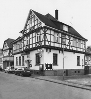 Durch Ecklage an der Einmündung einer kleinen Gasse und Straßenaufweitung hervortretendes Fachwerkgebäude auf massivem Sockel, giebel- und traufständige Gebäudeteile miteinander verschnitten, das weit vorkragende Fachwerk vom Beginn des 20. Jhs. in historisierenden Formen und Details. Auch ortsgeschichliche Bedeutung als „Gasthof zum Rathaus".