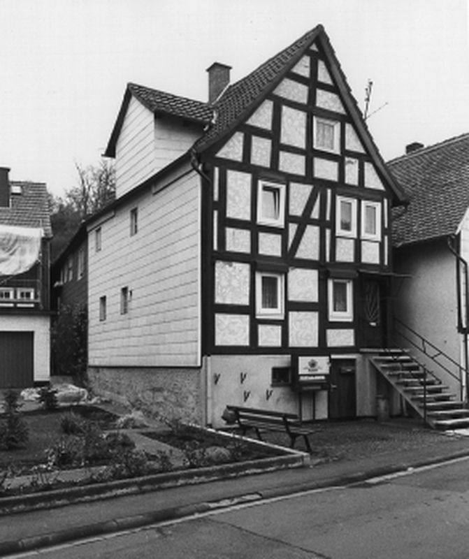 Gegenüber dem Nachbarn etwas zurückgesetztes, giebelständiges Wohnhaus als Teil der Straßenrandbebaung. Die Konstruktion mit durchgehenden Eck- und Bundständern legt eine Entstehung womöglich noch im 17. Jh. nahe. Der hohe Sockel beherbergte ursprünglich den Stall, die Fassade ist durch Kratzputz aus feingezeichneten, floralen Elementen geschmückt.