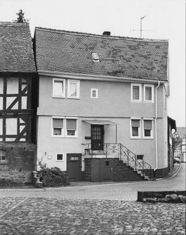 Wohnhaus mit schiefwinkligem Grundriß am Übergang des Marktplatzes in die Straße Im Tal. Unter der allseitigen Putzverkleidung ein Fachwerkrähmbau mit bis in den Keller reichendem Fachwerk, am Geschoßwechsel zu den Giebelseiten überstehende Balken; im Keller ehemals Stallnutzung. Der Bau ist in die ersten Hälfte des 18. Jhs. zu datieren.
