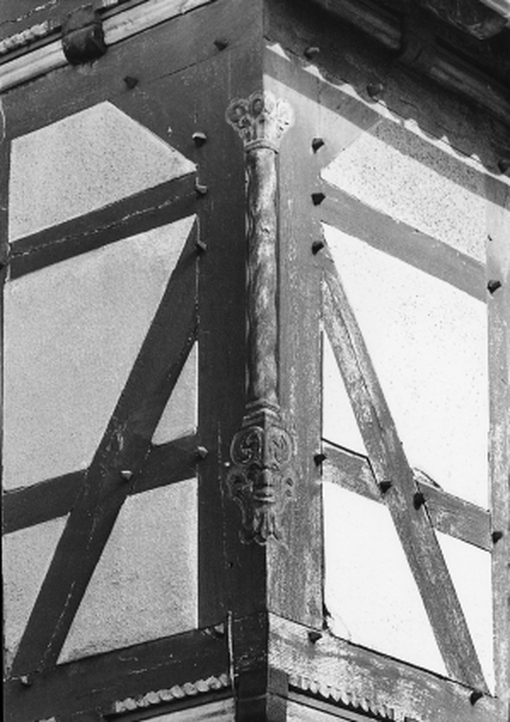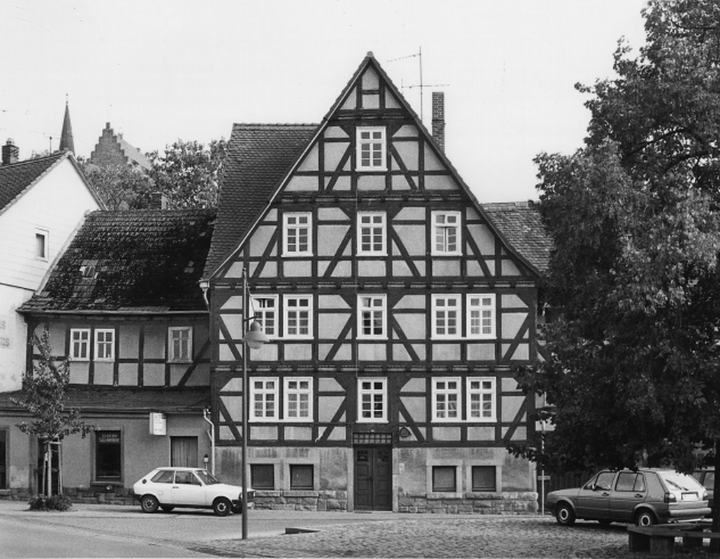 Hoch aufragendes, dreigeschossiges Wohnhaus, das in seiner giebelständigen Stellung und mit der original erhaltenen, ausdrucksvollen Fachwerkfassade den Marktplatz beherrscht. Achsial gegliedertes Fachwerk aus der Zeit des Heimatschutzstils um 1900 mit historisierenden Mannfiguren, Geschoßversprüngen und Schnitzwerk ist den Häusern der „Neustadt" nachempfunden. Rechts angeschlossen ein traufständiger Scheunenflügel gleicher Bauzeit.
