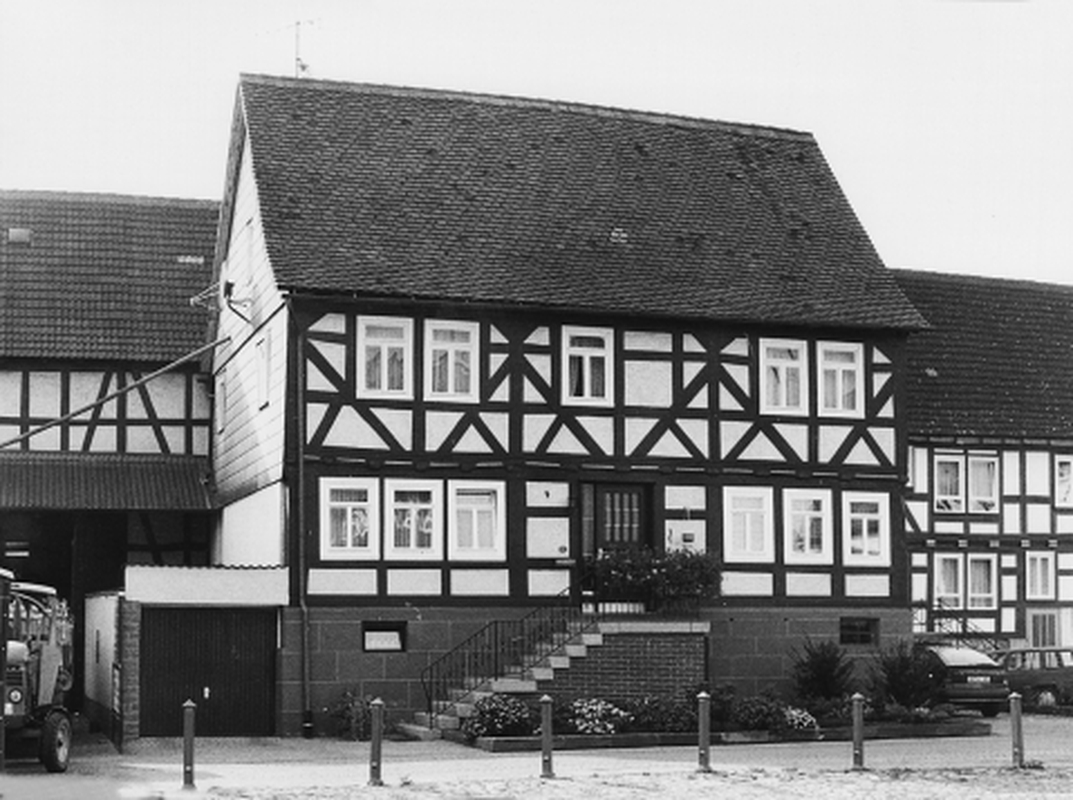 In den Platzraum vortretendes, traufständiges Wohnhaus auf hohem Werksteinsockel, das Fachwerk des Rähmbaus aus der zweiten Hälfte des 18. Jhs. mit breitstehenden Mannfiguren in der Trauffassade und geschwungenen Streben auf der rechten Giebelseite. Das Erdgeschoß gekennzeichnet durch die gruppenweise Zusammenfassung von jeweils drei Fenstern.