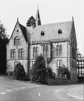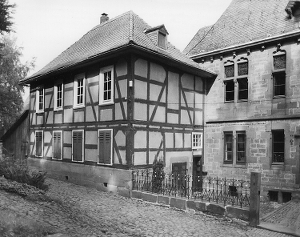 Städtebaulich bedeutsamer Baukomplex, der den östlichen Eingang der Altstadt markiert: hoher zweigeschossiger Werksteinbau mit spitzem Dach und vorgeblendeten Giebeln im Kreuzungsbereich dreier Strassen gelegen, 1868 mit Stilelementen der Neoromanik und der Neugotik mit gekuppelten Fenstern und Erker an der Ostfassade errichtet. Zur "Neustadt" der Eingang mit wappensigniertem Vordach und dem durch Rundbogen und Fensterrosette hervorgebogenen Blendgiebel. Im Inneren erdgeschossig Verwaltungsräume, im Obergeschoß Damenzimmer und Festsaal; dieser in Originalausstattung und -möblierung mit spitzbogiger Holzbalkendecke und Wandvertäfelung erhalten. Das Gebäude beherrbergt heute die Schenck'sche Forstverwaltung. An der Rückseite gegenüber dem achteckigen Treppenturm der Kavaliersbau (Haus Nr. 18b), ein vierachsig gegliedertes Fachwerkgebäude des 19. Jhs. mit Walmdach, errichtet auf einem Sockelgeschoß, das laut Inschrift zum Wohnhaus des Amtsverwesers Iohann Melchior Usener gehörte und 1715 erbaut wurde.