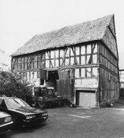 Laut Inschrift 1823 erbaute Scheune als Teil des ehemals im Norden vollständig geschlossenen Scheunengürtels. Die geschoßhohen, stets den Kreuzungspunkt Stiel-Riegel schneidenden Streben bestimmen das Bild des Fachwerks. Zum Teil liegt das sorgfältig hergestellte Flechtwerk der Gefache unverputzt offen. Giebelseitig eine lange, urwüchsige Schwelle sowie eine Verkleidung aus handgestrichenen Biberschwanzziegeln.