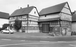 Bei der Einfahrt in die „Neustadt" an einer Straßenaufweitung gelegene Hofanlage von besonderer städtebaulicher Bedeutung. Das Wohnhaus traufständig, etwas zurückgesetzt, Rähmkonstruktion der zweiten Hälfte des 19. Jhs. auf hohem Sockel, das Fachwerk mit 3/4-Streben symmetrisch gegliedert, Eingang über einläufige, senkrecht angeordnete Treppe. Über Eck angeschlossen die Scheune, deren Giebel ist zur Straße mit einem Behang aus handgefertigten Biberschwänzen versehen, darin Jahreszahl 1864.