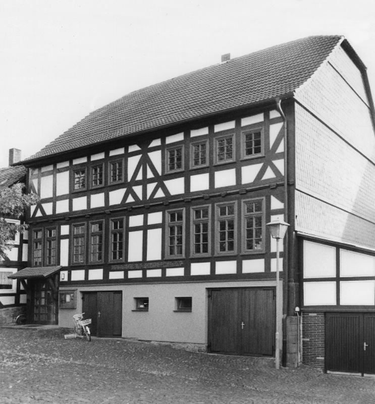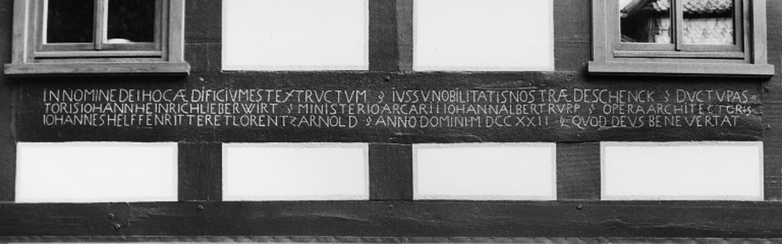 Den Platz seitlich der Kirche begrenzender Fachwerkbau in Rähmkonstruktion; der heute gleichmäßig gegliederte Bau ehemals Pfarrscheune, wie der noch erhaltene Torsturz mit Inschrift und Datierung 1722 im inzwischen massiv erneuerten Untergeschoß belegt: „IN NOMINE DEI HOC AEDIFICIUM EST EXTRUCTUM. IUS SU NOBILITATIS NOSTRAE DE SCHENCK. DUCTU PASTORIS IOHANN HEINRICH LIEBERWIRT. MINISTERIO ARCARII IOHANN ALBERT RUPP. OPERA ARCHITECTORIS IOHANNES HELFENRITTER ET LORENTZ ARNOLD. ANNO DOMINI MDCCXXII. QUOD DEUS BENE VERTAT". Heute genutzt als Gemeindehaus der Pfarrgemeinde.