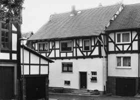 Traufständiges Wohnhaus mit massiv erneuertem Erdgeschoß, das Gebäude ist Teil der Platzbegrenzung an der Kirche. Die Fachwerkgestaltung des Obergeschosses mit den gebogenen Streben bezeugt einen Bau wohl noch des 17. Jhs., dessen Fachwerk ehemals bis in den Keller reichte, wo neben dem ebenerdigen Eingang auch eine Stallnutzung untergebracht war. Als Besonderheit kann die Verzierung der Kopfhölzer durch Herzen aufgeführt werden.