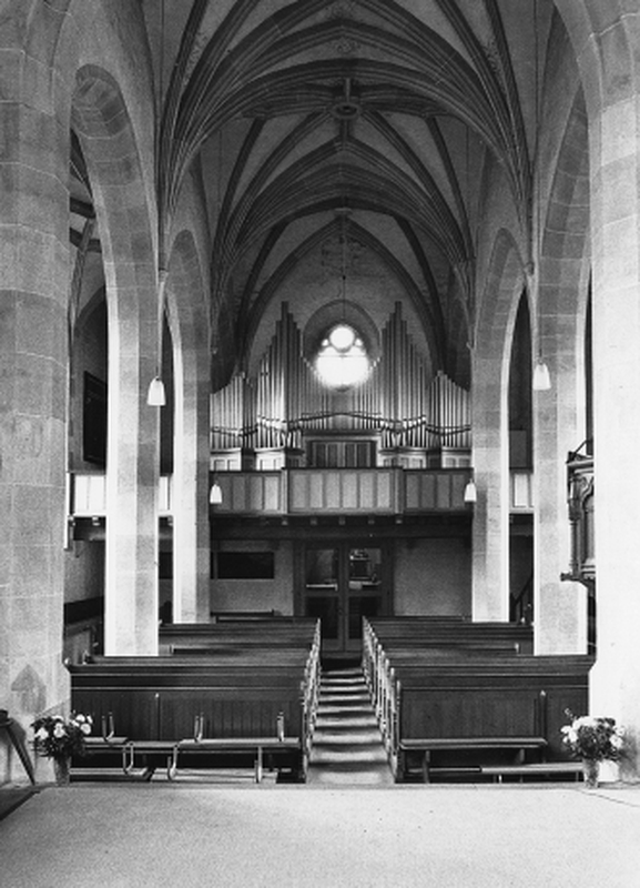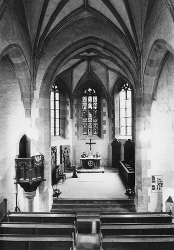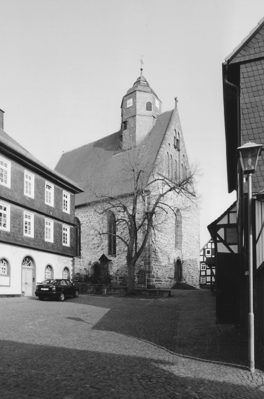 Ehemals St. Stefan. Als schlichte dreischiffige Hallenkirche zu drei Jochen mit sehr schmalen Seitenschiffen und höherem Mittelschiff. Der geräumige Chor aus einem Joch und 5/8-Schluß ist breiter als das Mittelschiff; in der Nordwestecke ein eingebauter Treppenturm, nach außen durch die Sakristei verdeckt. Im Langhaus Achteckpfeiler ohne Kapitelle. Reiche Stern- und Netzgewölbe, z.T. auf figürlichen Wandkonsolen, die Schlußsteine mit Wappen versehen. Der Glockenturm als gedrungener, achteckiger Dachreiter mit Schiefverkleidung. Die Kirche wurde um 1260 von den Schenck zu Schweinsberg gestiftet, Das Datum des Neubaus von 1506 ist auf einem der Pfeiler festgehalten; während des Dreißigjährigen Krieges 1635 und 1646 abgebrannt und zwischen 1657 und 1664 wiederhergestellt. 1885-86 wurde die Kirche im Bereich des Westgiebels und des Dachreiters restauriert, 1957 erneuerte man die ursprüngliche farbige Ausgestaltung. Im Inneren hat sich ein Taufstein von 1619 erhalten, im Chor die ehemalige Grablege der Schenck zu Schweinsberg mit sieben Grabsteinen, der älteste ein Doppelstein für Volpert Schenck zu Schweinsberg (gest. 1494) und Anna geb, Schlitz gen. Görtz. Außen neben dem Nordportal gotischer Opferstock und Grabmal für Prof. Georg Estor (gest. 1773) durch den Bildhauer Joh. Philipp Sommer mit gut gearbeiteter Rokoko-Rahmung und altem Eisengitter. Die Kirche ist in ihrer Umgebung stark eingebaut, nimmt jedoch durch ihre Höhe im Zusammenspiel mit den Gebäuden der Burg nach Westen hin eine dominante Stellung im Stadtbild ein.