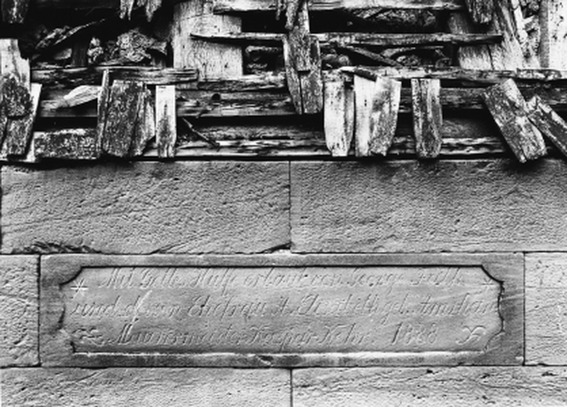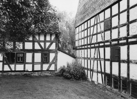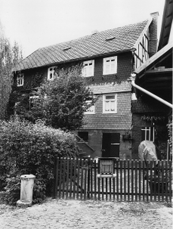 Die Südwestecke des Kirchhofes zweiseitig begrenzende Hofanlage, die sich zur Straße hin durch einen vorgelagerten Wirtschaftsraum öffnet. Das in der Straßenflucht zurückstehende Wohnhaus ein weitgehend durch Holzschindeln verkleideter Rähmbau auf hohem Werksteinsockel, in dem noch Stalltüren vorhanden sind. Das hochliegende Erdgeschoß ist durch eine einläufige, aus der Bauzeit des 18. Jhs. stammende Sandsteintreppe erschlossen. Als oberer Abschluß Deckung mit Betondachplatten aus Momberg. Die Scheune links ein breitgelagerter Fachwerkbau mit Mansarddach, im Sockel inschriftliche Datierung 1888; am rückwärtigen Giebel zum Kirchhof hin in sieben Gefachen ein Kratzputzornament, wie es in Speckswinkel nur hier vorkommt. Das Wirtschaftsgebäude rechts mit Inschrift am straßenseitigen Giebel: „Dietrich Bornmann und seine Ehefrau Barbara geborne Hehr haben diese Scheuer erbaut den 1ten Oktobr 1821 Zim. war Berlet".