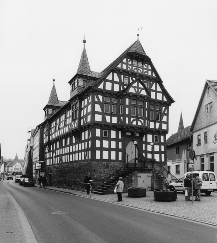 Ehemaliges Rathaus der Stadt Neustadt, zweigeschossiges Fachwerkgebäude auf hohem Steinunterbau, kräftiger umlaufender Geschoßversatz, leicht gebogene Langstreben, in den Brüstungsfeldern teilweise Viertelkreishölzer, beide Traufseiten mit vorspringenden Fenstererkern, über denen sich spitzhelmbekrönte Gauben erheben, über der zweiläufigen Freutreppe am Marktplatz ein größerer Erker mit leicht geschwungenem Giebel. Der Ursprungsbau von etwa 1360 mit steinernem Erdgeschoß und Tonnengewölbe brannte 1556 während des großen Stadtbrandes ab. Der heute sichtbare Nachfolgebau wurde 1557/1558 auf den Ruinen in abgewandeltem Fachwerkaufbau neu errichtet; nach zahlreichen Veränderungen und Umbauten, z.B. Türmchen über dem Marktplatzgiebel 1830, Sanierung ab 1988 als Rekonstruktion im Sinne der Erbauungszeit von 1557. Über dem spitzbogigen Eingang in der Schwelle des Erkers Inschrift: „hoga calenaugus anno funzenhvdert fvnfzig". Unterhalb der Freitreppe großes, möglicherweise prähistorisches Steinmal.
