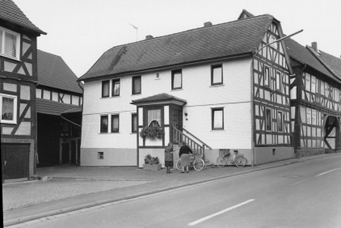 Hakenhofanlage mit giebelständigem, in den Straßenraum ragendem Wohnhaus, dessen Straßengiebel sich mit ungewöhnlichem Fachwerk schmückt: an nach innen gekehrten Streben sind divergierende Kopfbänder angebracht, die strenge Symmetrie wird durch das Leitermotiv zwischen den Fenstern verstärkt. Rähmbau ohne Geschoßversprung mit traufseitiger Verkleidung durch Holzschindeln. Das Wohnhaus ebenso wie die zeitgleiche Scheune entstammen der zweiten Hälfte des 19. Jhs. Zugehörig zwei Stallscheunen in Fachwerk.