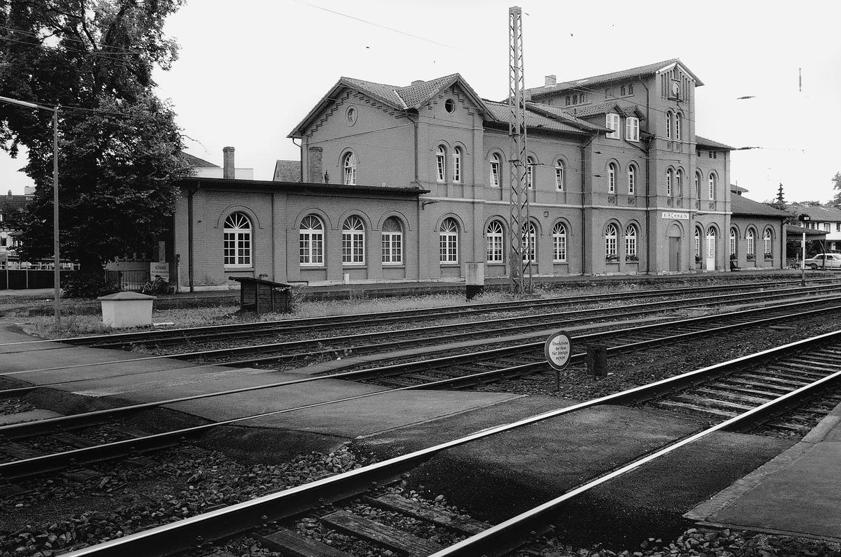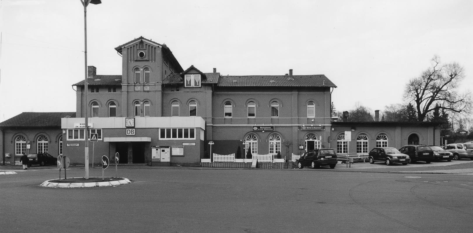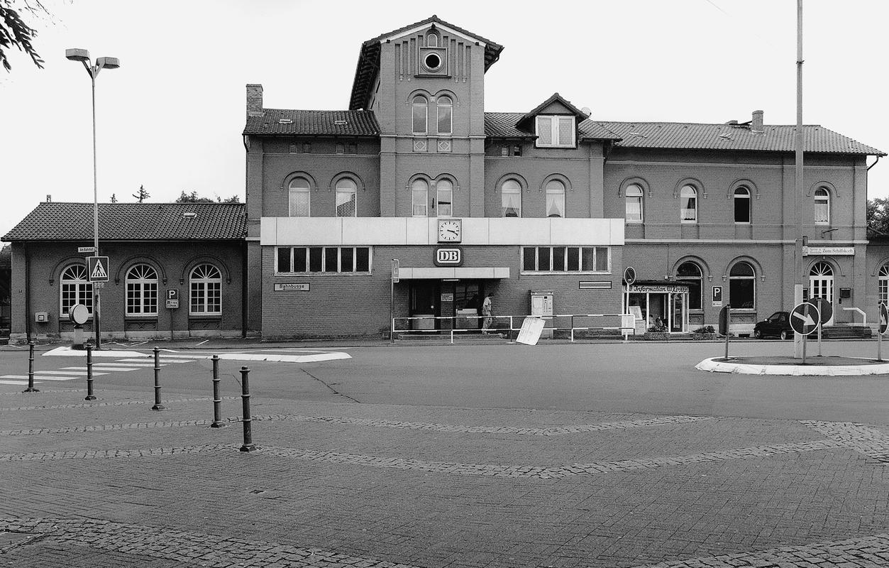 Stations- und Verwaltungsgebäude, erbaut 1849. Parallel zur Schiene angeordnetes Bahnhofsgebäude, entsprechend den Bahnhöfen in Treysa und Neustadt. In der Mitte ein zweigeschossiger Klinkerbau mit überhöhtem Mittelrisalit. Die seitlichen eingeschossigen Anbauten in Backstein um 1900 ergänzt. Differenziert gestaltete Fassade durch rundbogige, regelmäßig angeordnete Fenster mit Rippenbogen und eingezogener Brüstung sowie Werksteingesimse und reiches Schnitzwerk an den Dachüberständen. Zur Stadtseite in jüngerer Zeit einstöckiger Vorbau mit Flachdach. Das spätklassizistische Gebäude wurde erbaut von dem Architekten Julius Eugen Ruhl als Kopfbau der auf den mittelalterlichen Stadtkern zulaufenden Bahnhofstraße, gleichsam als Gegenstück zum Rathaus.