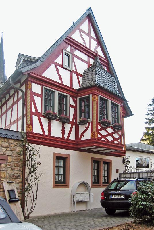 Giebelhaus am westlichen Ausläufer des Marktplatzes. Über massivem Erdgeschoss erhebt sich das Obergeschoss aus reichem Fachwerk, erbaut um 1660 (d). Die zum Markt hin orientierte Giebelfassade zeichnet sich durch einen Erker mit Haubendach und Rautengitter in der Brüstung aus. Die Schnitzerei zeigt Renaissance-Motive, gedrehter Stab und Schuppenstab mit Voluten, sowohl an den Eckpfosten der Giebelfassade als auch an denen des Erkers. Balusterähnliche Brüstungshölzer, genaste Streben und geschnitzte Knaggen ergeben ein lebhaftes Bild. An den Traufseiten einfaches, konstruktives Fachwerk. Hofseitig der Eingang mit biedermeierlicher Tür der 1. Hälfte des 19. Jhs. Die zugehörige eingeschossige Scheune im Hof wurde nach 1960 durch ein modernes Wohnhaus ersetzt.