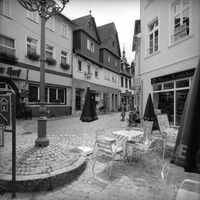 Aus ehemals zwei Häusern entstandenes Wohngebäude. Ein um 1515/16 (d) errichteter, schmaler, hoher Giebelbau wurde im 18. Jh. durch Umbau und Erweiterung in ein Traufenhaus mit Satteldach und einem weiteren Zwerchhaus einbezogen. Damit einher gingen Veränderung und Verputz des Obergeschosses sowie die Verkleidung der beiden Giebel, die jedoch ihre charakteristische, altertümliche Form mit kleinen Firstwalmen – der eine davon mit geschnitzter Konsole und Dachaufsatz – beibehielten. Bemerkenswert hier außerdem ein Traufbrett mit Ornament unter neuem Anstrich (vergl. Rheingauer Straße 19). Das Erscheinungsbild des Gebäudes wurde durch einen Ladeneinbau und moderne Materialien teilweise unkenntlich. Der südliche Giebel besteht aus (innen sichtbarem) qualitätvollem, spätmittelalterlichem Fachwerk in zeittypischer Figuration mit gebogenen, überblatteten Streben. Eine vermutlich bauzeitliche Spindeltreppe wurde bei der letzten Innenrenovierung entfernt.
