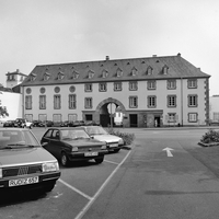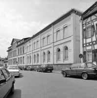 Verwaltungsgebäude am Matheus-Müller-Platz, ehemals Ortsausgang nach Erbach. Erbaut 1928 nach Wettbewerb von 1921, Architekt: Adolf Abel, Stadtbaumeister, Köln (vielleicht unter Beteiligung von Karl Siebrecht, Hannover). Gestreckter, dreigeschossiger Gebäuderiegel, parallel zur Landstraße, jedoch zurückgesetzt. Nördliche Einfassung und Begrenzung des Firmengeländes, gleichzeitig Torbau und Haupteinfahrt. Massivbau in traditioneller Architektursprache mit Putzfassade, Sandsteingewänden und verschiefertem Walmdach mit Gauben. Durch Sandsteinverkleidung akzentuierte, rundbogige Einfahrt und Eingangsbereich, Eckquaderung. Innere Funktionen ablesbar an unterschiedlichen Fensteröffnungen – hoher Saal (Ahnensaal) und Einzelräume. Im Inneren großzügiger Treppenaufgang mit Stahlgeländer. Östlich davon bis zur Stadtmauer und zur Leergasse ältere Hallen des späten 19. Jhs. Ehemals zweifarbige, gegliederte Ziegelfassaden, heute außen verputzt und verändert, jedoch als städtebauliche Begrenzungen im Bereich Rheingauer Straße, Schmiedegässchen und Leerstraße bedeutsam. Ein quadratischer Wasserturm im Gelände wirkt als weithin sichtbares Zeichen. Zwischen Leerstraße und ehemaliger Stadtmauer liegt der Sohlern''sche Hof aus dem 18. Jh. Erwerb des Anwesens durch Anton Edler von Sohlern 1719, um 1811 Besitz des Matheus Müller, 1915 teilweise durch Brand vernichtet. Von einer mehrflügeligen Anlage ist das Wohnhaus erhalten. Rechteckiger Putzbau, Fenster mit Ohrenumrahmung, Tür in reich profiliertem Gewände, von Pilastern flankiert und mit gebrochenem Giebel überdacht; darin Kartusche mit Allianzwappen. Im rechten Winkel dazu jüngerer ehemaliger Pferdestall (verändert) mit Kreuzgewölben auf gusseisernen Stützen. An der Leerstraße barocke Mauerreste mit Ohrengewände aus Sandstein.