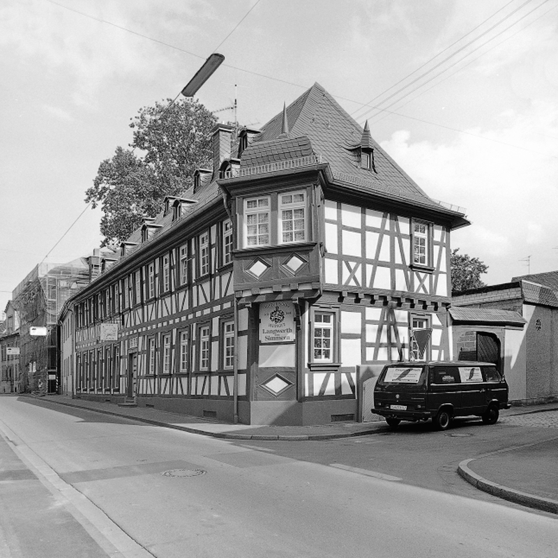 Das langgestreckte Fachwerkwohnhaus mit Walmdach an der Ecke Kirchgasse bildet die Nordwestecke des Hofes Langwerth von Simmern. Der früher verputzte Bau aus der 1. Hälfte des 18. Jhs. zeichnet sich durch einen markanten, über Eck gestellten rechteckigen Fachwerkerker mit Haubendach und Rautenbrüstungen aus (Rautenbrüstung im Erdgeschoss neu, anstelle eines vorherigen Eingangs). Fenster mit erneuerten Ohrengewänden, im Erdgeschoss teilweise als Schaufenster vergrößert. Das Gebäude besitzt eine besondere straßenraumbildende Funktion und malerische Wirkung.