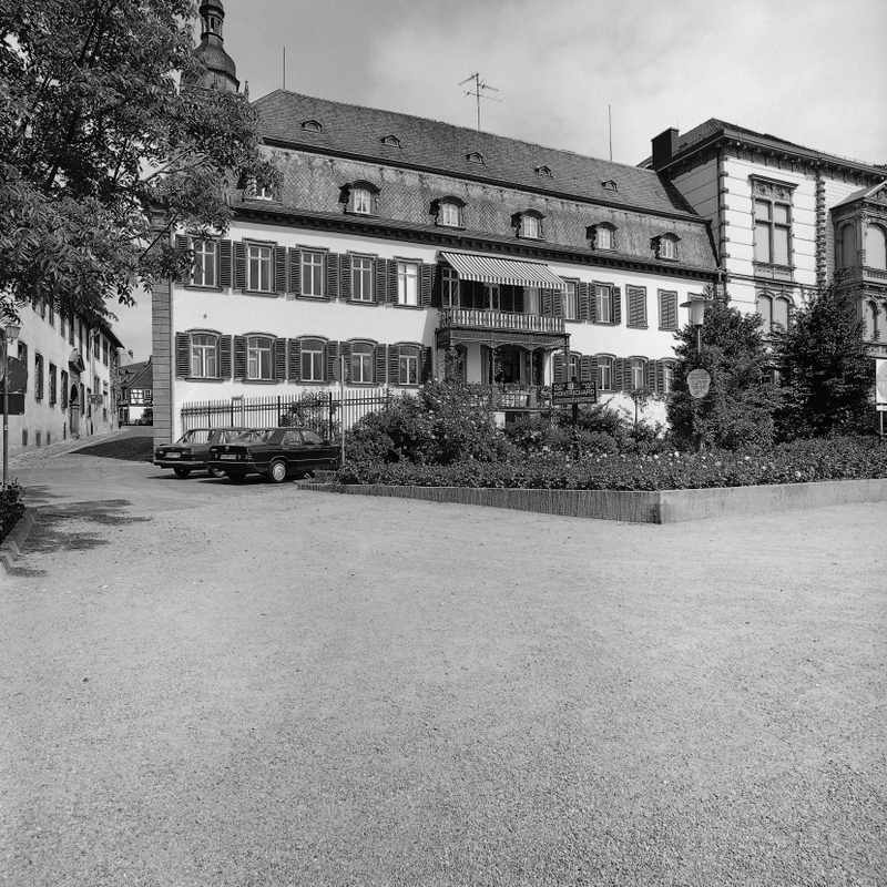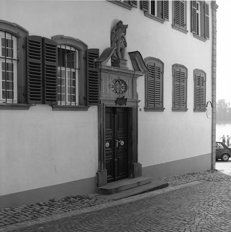 Sehr stattlicher zweiflügeliger Massivbau über winkelförmigem Grundriss mit 13 zu 7 Achsen. Die Hauptfassade orientiert sich zum Rhein. Putzwand mit gequaderten Eckpilastern, Fenster mit Ohrenumrahmungen aus Sandstein, im Erdgeschoss als flacher Segmentbogensturz abschließend. Mansardwalmdach durch Höherlegung der Traufe und Fortführung als Satteldach bis zum Nachbargebäude verändert; reizvolle verzierte Gauben. Eingang an der Rosengasse mit tief gekehltem Gewände und ovalem Oberlicht mit Ziergitter. Im geschweiften Giebel Figur des hl. Florian, Sandstein, 18. Jh. Ein gusseiserner Verandavorbau an der Südseite wurde im 19. Jh. angefügt.