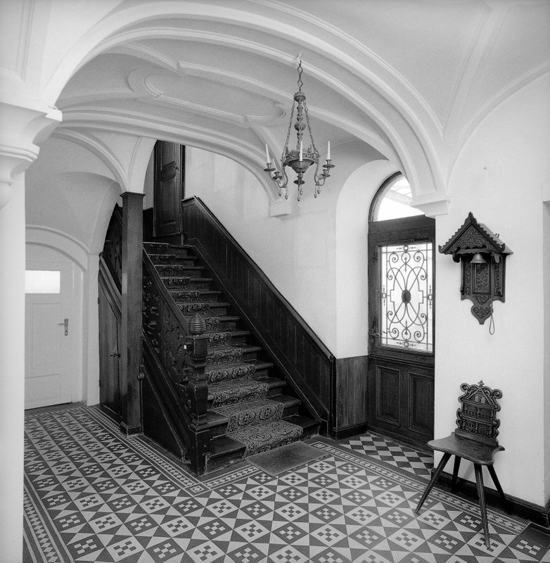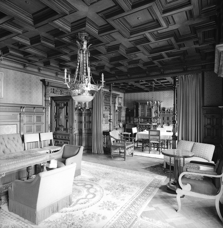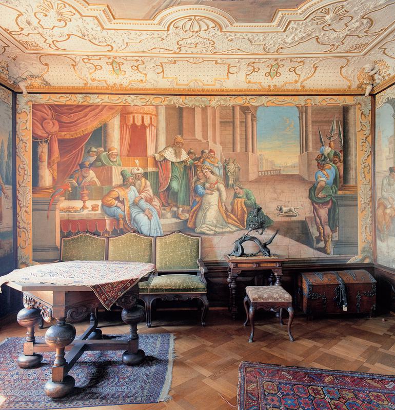 Im Obergeschoss Festsaal und Kabinett mit ausgezeichneter Stuckdekoration von 1739 (bisher Daniel Schenk zugeschrieben, jedoch kommt nur ein Nachfolger in Frage) und reichen Wand- und Deckenausmalungen eines unbekannten Malers. Die nach Signatur von Phillip Jakob Wagner, Mainz, 1868 überarbeiteten Gemälde zeigen fünf Variationen zum Themenkreis der irdischen und himmlischen Liebe. In den Wohnräumen des Erdgeschosses reiche Holzarbeiten von Bembé, Mainz, um 1830, vor wenigen Jahren größtenteils durch Brand zerstört. Zahlreiche wertvolle Ausstattungsdetails des 18. und 19. Jhs. sind erhalten. Aufgrund der Vollständigkeit und des Reichtums der Ausstattung herausragender profaner Barockbau des Rheingaues und wesentlicher Bestandteil der Eltviller Rheinansicht.