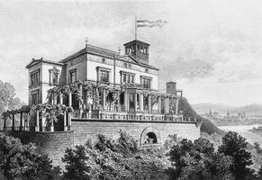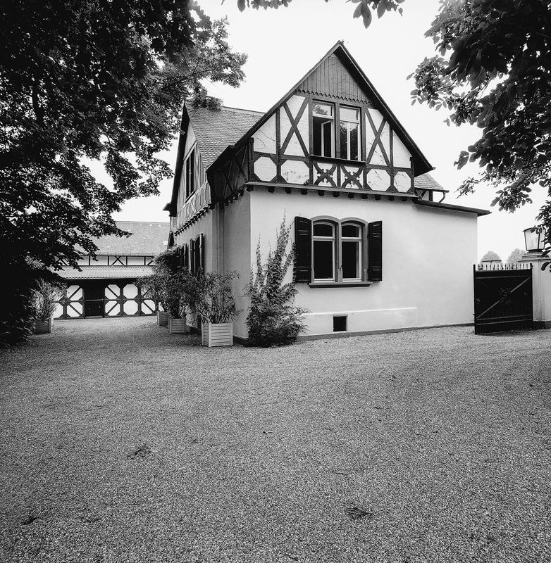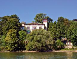 Repräsentatives spätklassizistisches Landhaus. Symmetrisch dreigeteilter Hauptbau auf Rechteckgrundriss mit flachem Walmdach, daran seitlich angeschobene Elemente, ein Aussichtsturm mit offenem Obergeschoss und ein nachträglich mit Pyramidendach versehener Anbau. Die den Charakter des ländlichen Sommersitzes unterstreichende Pergola zur Rheinseite wurde nach 1965 entfernt. Der Entwurf zeigt außerdem eine geschossweise differenzierte Quaderung. Jetzt glatter Putz mit sandsteinroten Werkteilen. Fenster der Hauptgeschosse mit Pilasterumrahmung. Im Inneren teilweise geometrischer Deckenstuck; eine kassettierte und bemalte Holzdecke im Erdgeschoss. Große Terrassenanlage mit bastionsartigem Baumrondell über dem steil abfallenden Hang.