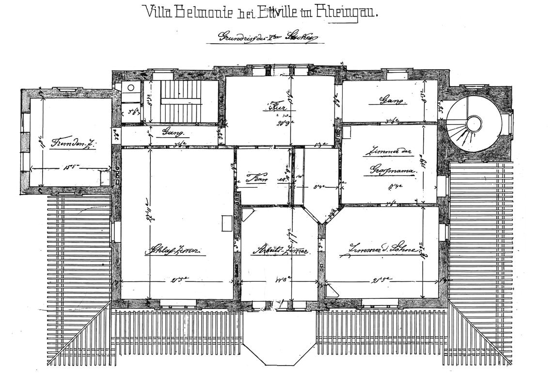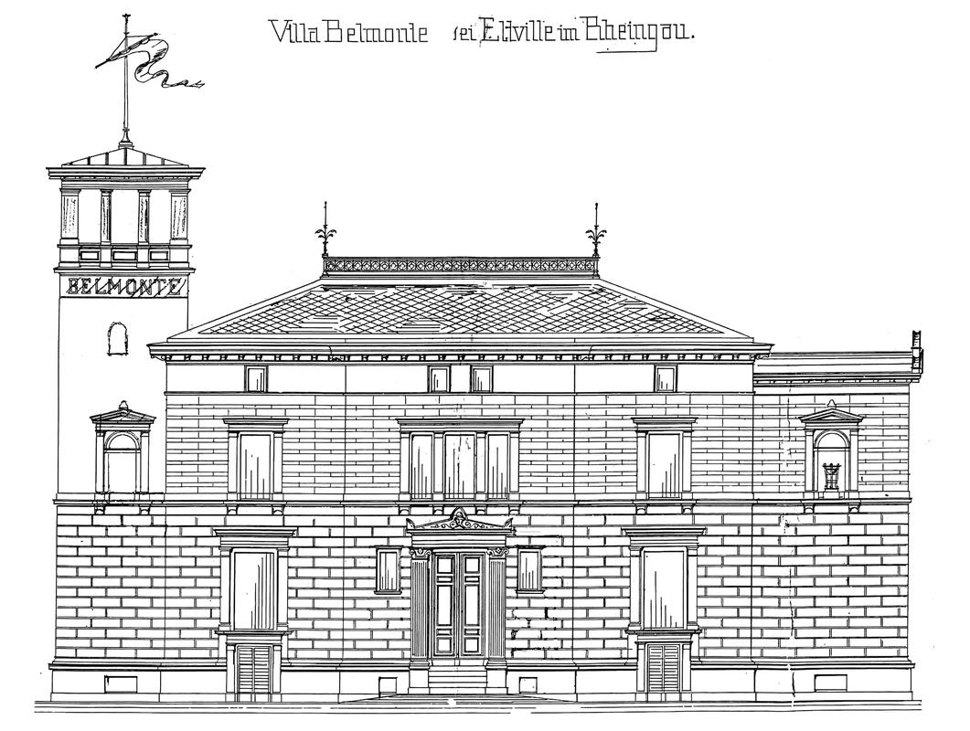 Erbaut 1870-72, Architekt: Hugo Licht, Berlin/Leipzig (1841-1923) als Villa Belmonte für Dr. Wilhelm von Oechelhaeuser (*1820 in Siegen, †1902 in Niederwalluf). Der Bauherr war Unternehmer sowie u. a. Generaldirektor der Dessauer Gas-, Elektrizitäts- und Wasserwerke; Reichsministerialassessor, Bürgermeister von Mühlheim/Ruhr, Reichstagsabgeordneter, Sozialpolitiker, Gründer der „Deutschen Arbeiterzeitung" und der „Deutschen Shakespeare-Gesellschaft". Für das Hobby seiner Ehefrau, die Hühnerzucht, wurde ein Hühnerhaus eigens entworfen. 1919 Verkauf des Anwesens, mehrere Besitzer nahmen bauliche Änderungen vor. Schreinerarbeiten im Haus führte die Niederwallufer Schreinerei Courtial aus. Erwähnt werden u. a. ein Speisezimmer aus Zitronenholz (entfernt in den 1930er Jahren) und der Einbau von Wandpanosen (Ölgemälde mit Blumenstillleben) aus einem Schloss in Den Haag (nicht erhalten).