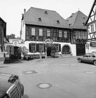Das traditionsreiche Gasthaus bildet neben dem Rathaus einen Blickpunkt in der Ortsmitte. Traufständiges, kompakt wirkendes Gebäude mit massivem Erdgeschoss, Fachwerk-Obergeschoss und hohem, verschiefertem Krüppelwalmdach mit kleinen Gauben. Im Erdgeschoss Ohrengewände sowie die ehemalige Hofeinfahrt in rundbogigem, profiliertem Sandsteingewände mit Wappenstein im Scheitel. Mittiger Hauseingang mit Oberlicht, im Türsturz mit Baudatum 1720 bezeichnet (das Datum wurde auch in die jüngere Putzbemalung übernommen). Das geradlinige Fachwerk mit Brüstungsrauten und Ohrengewänden entspricht dem des benachbarten Rathauses aus derselben Bauzeit. Die Gefachbemalung aus den 1920er Jahren, augenscheinlich von der Hand des Hattenheimer Malers Claudy, zeigt Weinranken und fügt sich mit guter Wirkung in die umgebende Gruppe ähnlicher Fassadendekorationen. Westlich anschließend eine Toreinfahrt des 19. Jhs.