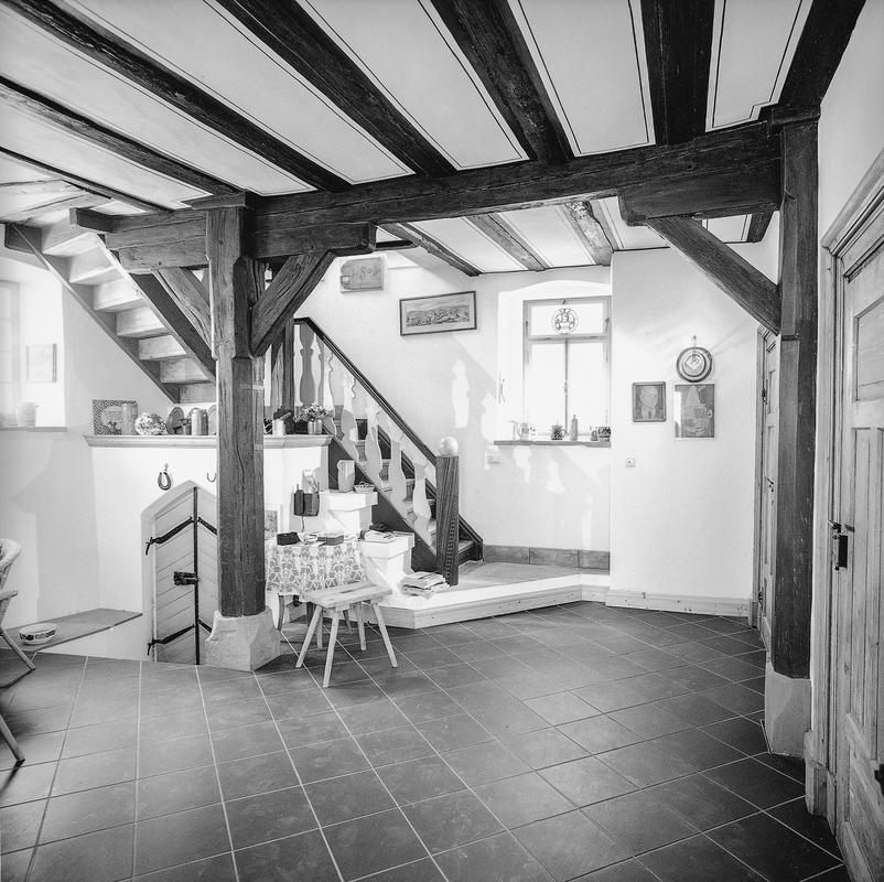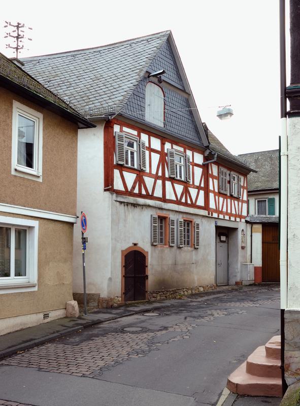 Fachwerkgehöft an der Ecke Fischergasse. Der Giebelbau geht auf das Jahr 1567 (d) zurück, Um- und Anbauten erfolgten um 1684. Im 18. Jh. wurde rechtwinklig der Traufenflügel mit überbauter Hofeinfahrt angefügt. Das Fachwerk-Obergeschoss erhebt sich über hohem, massivem, vielleicht älterem Unterbau mit rundbogigem Kellereingang. Der Kernbau zeigt im Fachwerk eine altertümlich wirkende Anordnung kurzer und langer Streben, im verschieferten Giebel eine Ladeluke. Beide Gebäudeteile wurden durch jüngere Fensteröffnungen verändert. Im hallenartigen Erdgeschoss trägt ein auf Holzstützen mit Streben und Sattelholz ruhender Unterzug die Balkenlage der Decke. Hier außerdem ein Kellerabgang und eine Treppe mit Geländer aus gesägten Balustern. Die Dachkonstruktion ist als stehender Stuhl mit Stuhlsäulen ausgeführt. Südlich des Wohnhauses anschließende Nebengebäude begrenzen den Hof zur Fischerstraße hin.