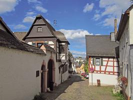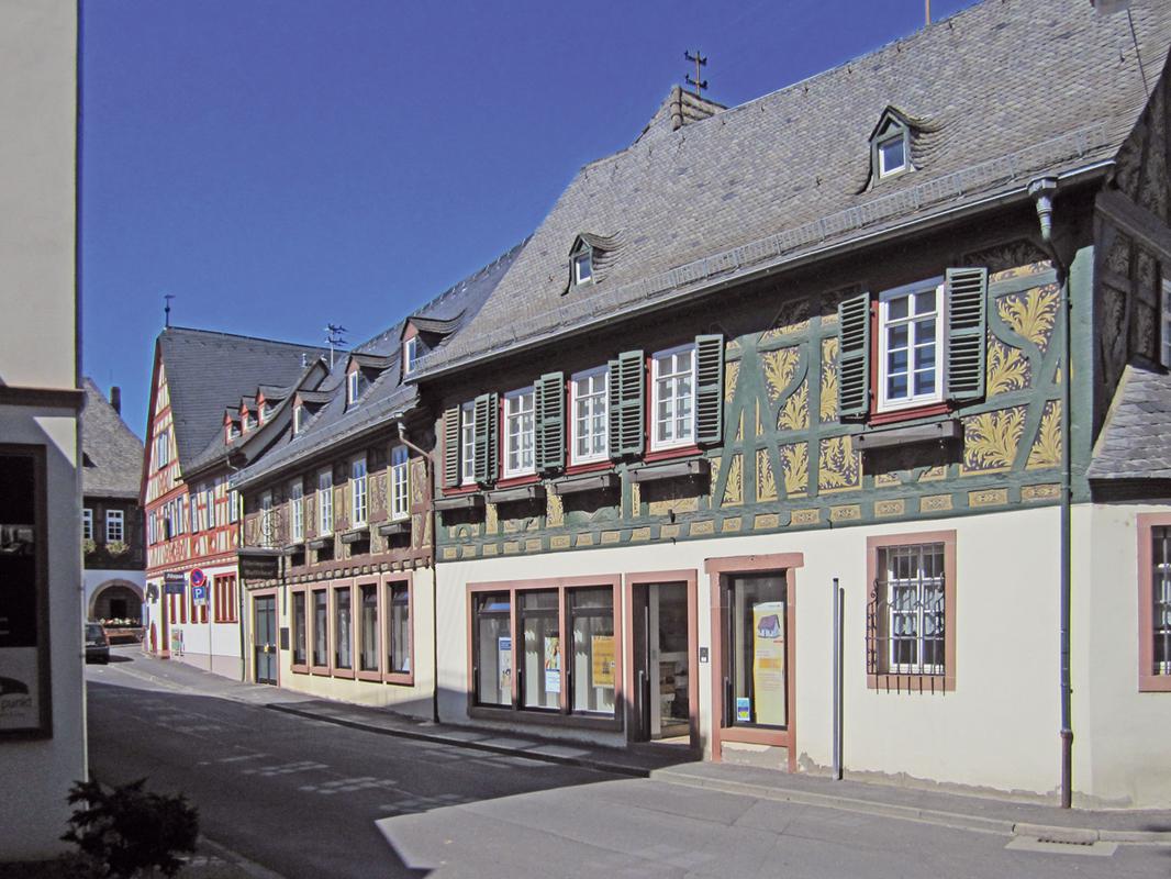 Die Burg und die vielleicht aus einer zugehörigen Kapelle hervorgegangene Pfarrkirche bilden heute den ältesten Kern der Bebauung. Die umgebenden Straßenzüge – Burgstraße und westlicher Abschnitt der Hauptstraße – zeichnen sich durch ihre bis auf das frühe 16. Jh. zurückgehende und qualitätvolle Bausubstanz aus. Besonders in der Hauptstraße ist die hervorragende Ensemblewirkung der teils aus Fachwerk errichteten, teils als Putzbauten ausgeführten Wohnhäuser hervorzuheben. Barocke Adelshöfe wie die der Grafen von Schönborn, Raitz von Frentz, Wachendorf sowie der stattliche katholische Pfarrhof bestimmen das geschlossene Straßenbild, das sich nur im Bereich des etwas angehobenen Kirchhofes aufweitet. Hinzu kommen wohlerhaltene Fachwerkbauten, unter denen das spätmittelalterliche Haus Nr. 36 von 1512 besonders zu erwähnen ist.