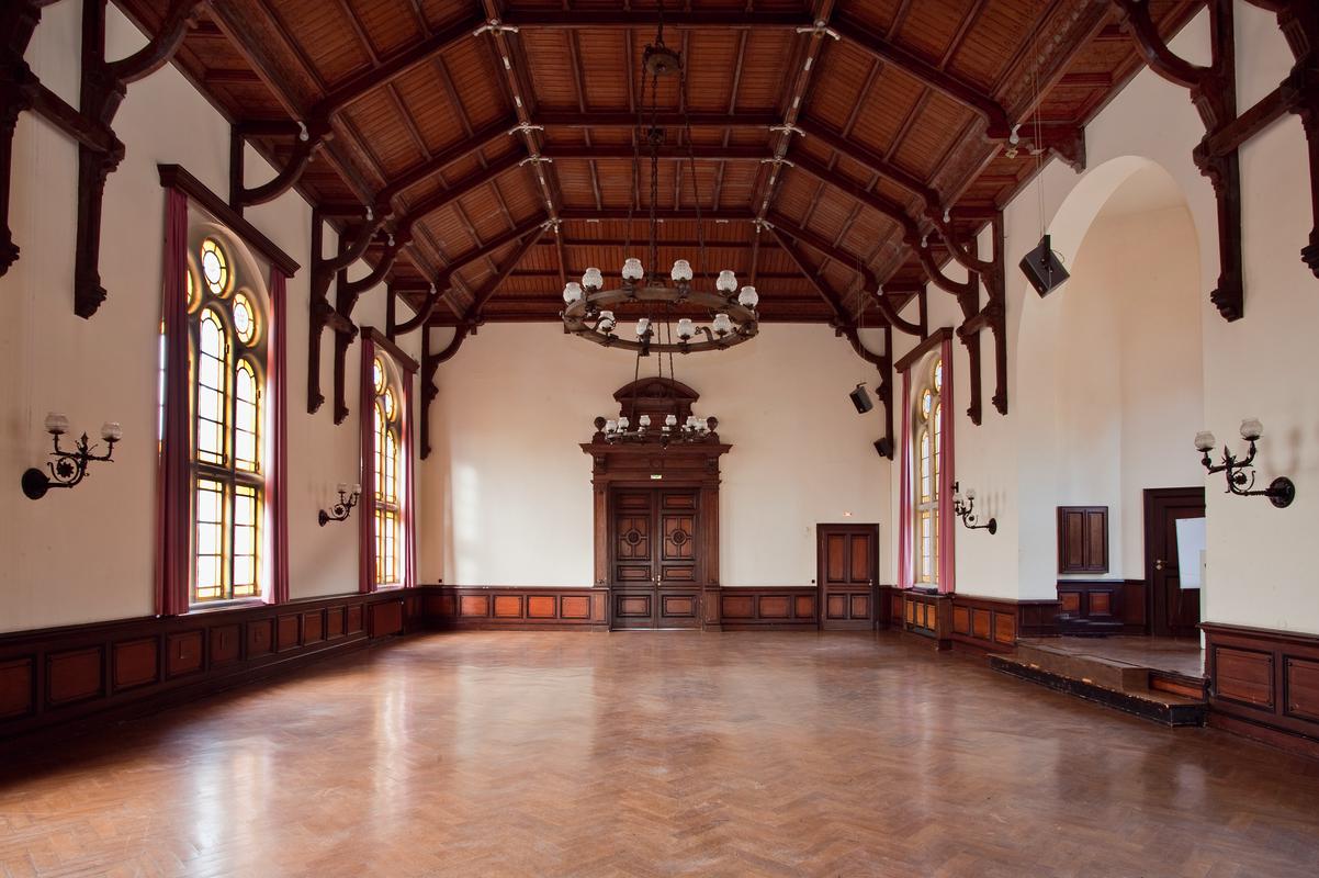 Festsaal mit Küche, eingeweiht 1877. Repräsentativer, hochaufragender Ziegelbau mit hohen Rundbogenfenstern über Rustika-Sockelgeschoss, das Küche und Wirtschaftsräume enthält. Das Innere des Saales wird bestimmt von der dekorativ gestalteten Deckenkonstruktion, hölzernen Lamperien, aufwendigen Türen mit Umrahmung in Neurenaissanceformen und farbig verglasten Fenstern.