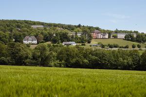 Davor ein Gedenkstein für die Kinder, die Opfer des Euthanasie-Programms der Nationalsozialisten wurden. Vom Eichberg aus wurden zwischen 1941 und 1945 über 2700 Patienten nach Hadamar gebracht und dort getötet.