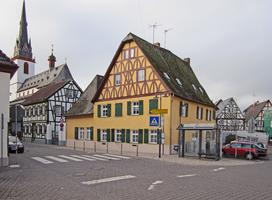 Stattlicher giebelständiger Fachwerkbau der Zeit um 1521/22 (d) mit hohem Satteldach und kleinem gebrochenem Firstwalm auf Konsole. Der heutige Baukomplex besteht aus ursprünglich drei Häusern. Die Fassade war vielfachen Veränderungen unterworfen: Im 18. Jh. Erneuerung der Hauptgeschosse mit regelmäßiger Anordnung der Fensterachsen und Verputz. Eingang früher giebelseitig mit klassizistischer Haustür und Oberlicht. Schieferdach mit kleinen Gauben (Foto um 1930). Danach Freilegung des Giebelfachwerks, Entfernung des straßenseitigen Einganges (Foto 1960). In jüngerer Zeit Vorblendung neuer Fachwerkhölzer im Giebel; die alte Konstruktion dahinter blieb erhalten. Weitere Fassadenänderungen der Gauben. Westlich anschließendes Nebengebäude mit verschiefertem Walmdach, ursprünglich ein nur wenig jüngerer Giebelbau mit nachträglich eingebauter Durchfahrt (Hängewerk im Dachstuhl); diese war früher durch eine Stichbogenöffnung mit hölzernem, oben diagonal vergittertem Tor mit Pforte abgeschlossen.Trotz äußerlicher Veränderungen ist die historische Bausubstanz im Wesentlichen erhalten. Eine besondere städtebauliche Bedeutung ergibt sich aus der zentralen, platzbestimmenden Ecklage am Markt. Nördlich schließt ein kleiner Hofraum mit Ummauerung an, darin die ehemalige Scheune. Die Hofeinfahrt ehemals flankiert von Torpfosten mit profiliertem Aufsatz.