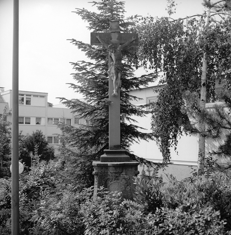 Wegekreuz aus dem Jahr 1736. Das (vielleicht nach dem Stifter benannte) Kreuz wurde von seinem früheren Standort in einer Mauernische an der Landstraße hierher versetzt und 1977 restauriert. Sockel und (erneuertes) Kreuz aus rotem Sandstein, Korpus aus grauem Sandstein. Geschweifter Sockel mit Verzierung und stark verwitterter Inschrift.