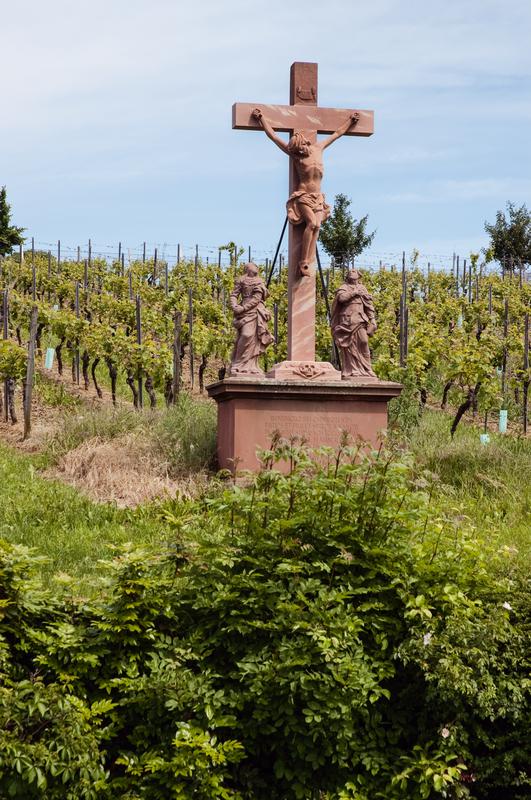 Kreuzigungsgruppe aus rotem Sandstein am Ortsausgang in Richtung Hattenheim (Flurbezeichnung Schlossberg oder Herberge). Wahrscheinlich handelt es sich um das "Carthaüser Creutz" im Gemarkungsplan von 1751. Die Kartäuser hatten bis um die Mitte des 18. Jhs. eine Niederlassung ein Erbach. Gekreuzigter Christus zwischen Maria und Johannes auf rechteckigem Sockel mit profiliertem Abschluss. Am Kreuzfuß ein Totenschädel als memento mori. Ausdrucksvolle Darstellung aus der Mitte des 18. Jhs., 1956 (Inschrift), 1987 und 1995 restauriert; dabei wurden die Assistenzfiguren durch Kopien ersetzt und die Originale ins katholische Pfarrzentrum verbracht. Das weithin sichtbare Flurdenkmal bildet in Verbindung mit Schloss Reinhartshausen und der Erbacher Pfarrkirche ein wirkungsvolles Element der reizvollen und ungestörten westlichen Erbacher Ortsansicht.
