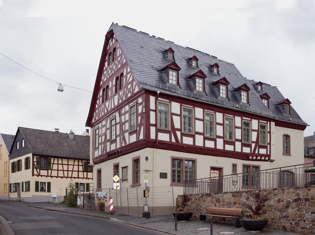 Prominenter Fachwerkbau an der westlichen Ecke des Kirchenvorplatzes, erbaut 1565 (d), mit rückwärtigem Anbau von 1591 (d). Über hohem, massivem Erdgeschoss leicht vorkragendes Obergeschoss. Die ursprünglich mit einem Mittelerker geschmückte Giebelseite zeichnet sich durch reiches Zierfachwerk mit geschnitzten Knaggen, Streben und Brüstungsformen aus. Damit steht der Bau in einer Reihe mit den ebenfalls auf das 16. Jh. zurückgehenden, schmuckreich gestalteten Fachwerkrathäusern von Geisenheim (nicht erhalten) und Martinsthal. Am Eckpfosten zwei geschnitzte Wappenschilde und Jahreszahl 1761. Diese (aufgemalte) Jahresangabe bezieht sich vermutlich auf einen Umbau. Im 18. Jh. wurden, unter Auswechslung von Fachwerkhölzern des Obergeschosses, die Fenster vergrößert und in Achsen angeordnet. Nur die Bundpfosten mit Streben bzw. zwei traufseitige (wiederverwendete) Streben sind als Reste des ursprünglichen Sichtfachwerks erhalten. Die westliche, unansehnlichere Traufseite ist nach Abbruch eines älteren Nachbargebäudes (alte Schule) freigestellt. Im Erdgeschoss befand sich bis in jüngere Zeit die Spritzenhalle mit oben vergittertem hölzernem Tor. An der Erdgeschosswand Gedenktafel für Johann Georg Hofmann, Bürgermeister und Organist in Rauenthal (1653-1725), 1885.