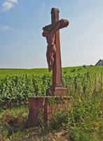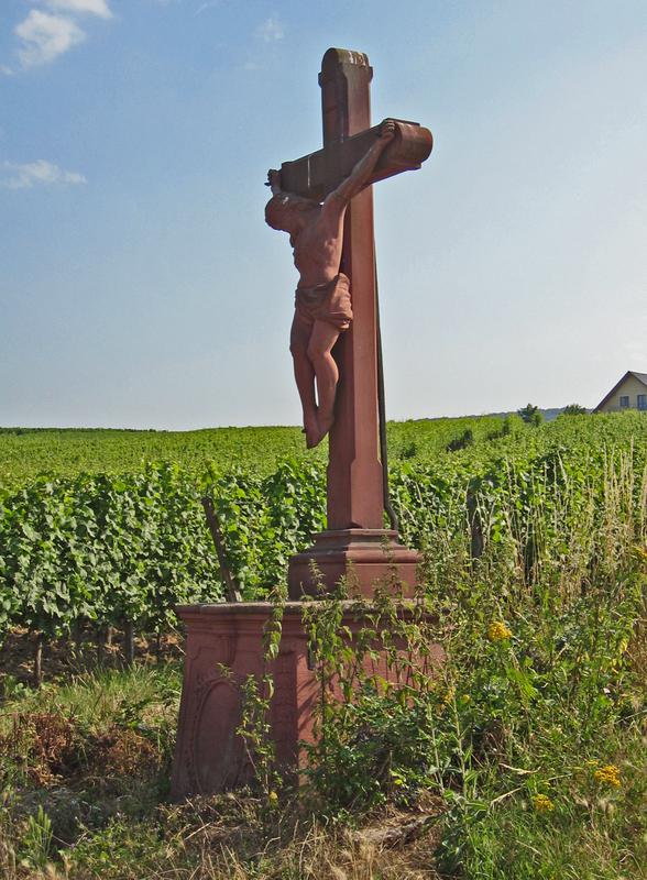 Wegekreuz am südlichsten Teil der Gemarkung. Etwa 3 m hohes Kreuz auf hohem, an der Vorderseite reich verziertem Sockel aus rotem Sandstein. Das wohl nachträglich ausgetauschte Kreuz mit gefasten Kanten und gerundeten Enden besteht aus anderem Sandsteinmaterial; eine Erneuerung des Wegekreuzes fand 1991 statt. Das Chronogramm der Sockelinschrift ergibt die Jahreszahl 1753.