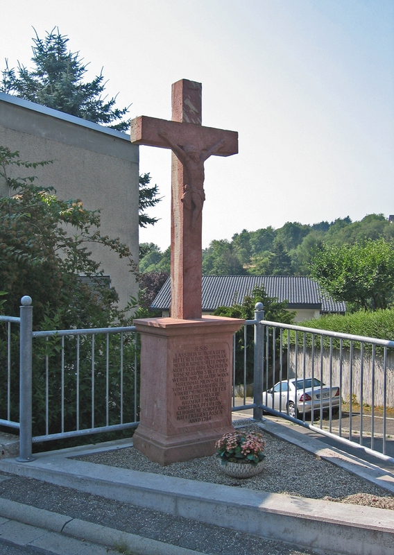 Das im Volksmund als Pestkreuz bezeichnete Kruzifix von 1786 wurde 1852 auf einen Gemeinderatsbeschluss hin an den jetzigen Standort versetzt. Hier wurden außerhalb des Dorfes bei einer Epidemie im 19. Jh. Bestattungen vorgenommen, da der Friedhof nicht ausreichte. Auf dem Sockel Spruchinschrift mit Nennung der Stifter: „..VON REIMUNDUS PFEIFFER UND SEINE EHELICHE HAUSFRAU MARIA CHRISTINA PFEIFERIN GEBOHRENE SCHOFFER HAT FERTIGEN LASSEN ANNO 1786."