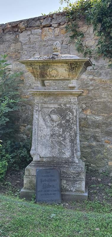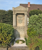 nahe der Friedhofsmauer, hoher Sockel mit Aufsatz in Form eines Sarkophags; Inschrift verwittert. 19. Jh.