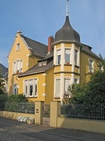 Eingeschossiges Wohngebäude mit zweigeschossigen Risaliten, der südliche polygonal mit Haubendach, der nördliche mit teilweise gestuftem Blendgiebel. Weitere renaissancehafte Elemente zeigen sich in gekuppelten Fenstern mit gekehlten Gewänden und Vorhangbögen. Schlichte verputzte Einfriedung mit Eisengittern. Bestandteil des historistischen Ensembles in der Adelheidstraße.