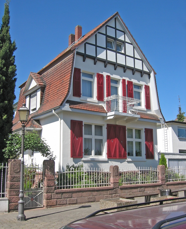 Wohnhaus mit Merkmalen des Heimatstils aus dem 2. Jahrzehnt des 20. Jhs. Giebelständig, eingeschossig, dominiert durch ein hohes Mansarddach mit Bieberschwanzdeckung und die symmetrische, durch ein Schürzendach horizontal geteilte Giebelfront. Rauputz mit angedeuteter Blendrahmengliederung. Prägnante Details sind das Fachwerk im Giebeldreieck, ein auf Konsolen auskragender Mittelbalkon mit eisernem Geländer, Fensterläden mit Rauten- und ausgeschnittenem Herzmotiv, der seitliche Eingang mit kleiner Vorhalle und die Einfriedung mit Pfosten aus reliefiertem Sandstein und eisernen Zaunelementen. Auffälliger Bau im Straßenbild der Holzstraße.