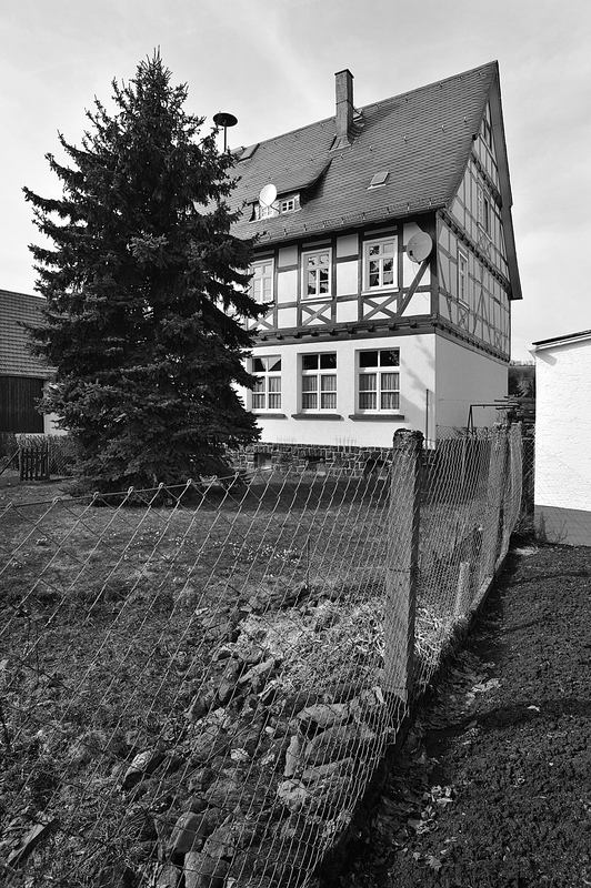 1913 am östlichen Rand des Dorfkerns errichteter aufwendiger Bau. Über einem Basaltsockel erhebt sich ein verputztes Hauptgeschoss; Obergeschoss und Giebel sind in teilweise verschieferter, repräsentativer Fachwerkkonstruktion mit Mann-Figuren, Andreaskreuzen und auch in den Giebeldreiecken ausgearbeiteten Geschossvorsprüngen gefügt. Den Bau schließt ein steiles, schiefergedecktes Satteldach. In der Mitte der Traufseite befindet sich die zweiläufige Freitreppe aus Basalthaustein mit hübsch überdachtem Haupteingang; dieses Gestaltungselement ist in Anlehnung an bäuerliche Anwesen etwa der Marburger Gegend, aber auch des Vogelsbergs geschaffen. Die ehemalige Schule stellt ein sehr ansprechendes Beispiel ihres Bautyps dar, wie er ähnlich vereinzelt bis nach dem Zweiten Weltkrieg erscheint. Das Haus war bis 1970 Schule und ist seit 1972 Dorfgemeinschaftshaus, der Umbau erfolgte äußerlich ohne starke Überformungen.